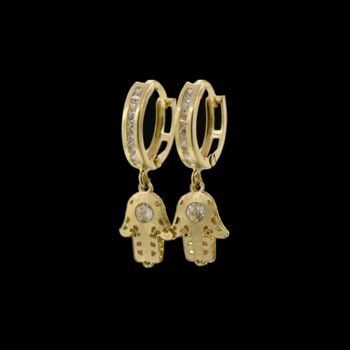 HUGGIE DE 10K CON PIEDRAS Y DIJE COLGANTE DE MANOS DE FATIMA CXR